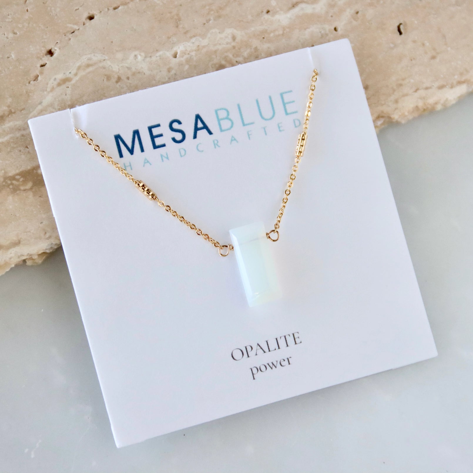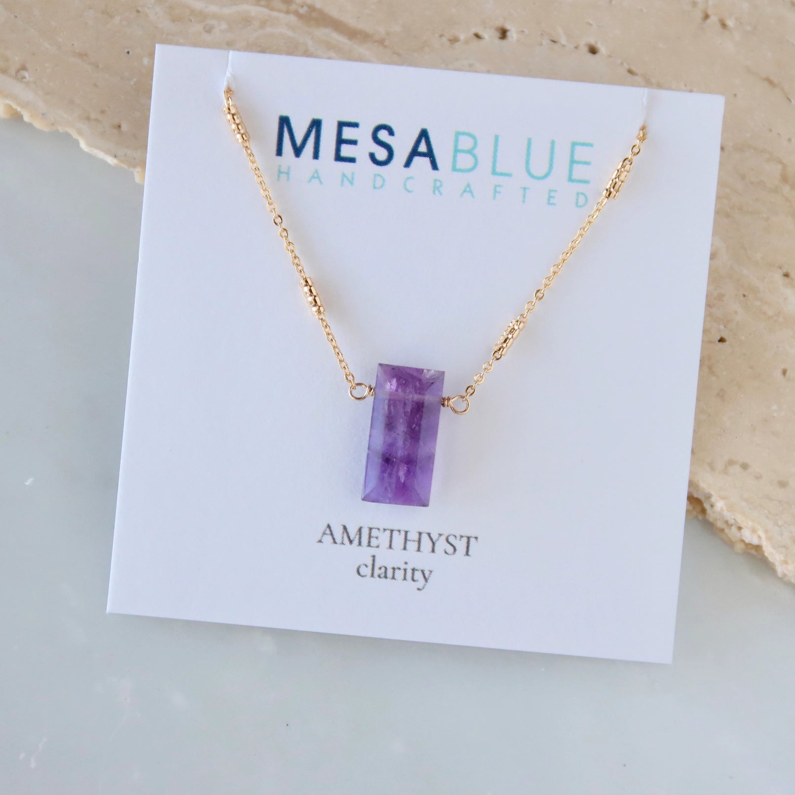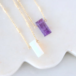 Details: • MATERIAL: 18K gold plated over brass, faceted amethyst or opalite • PENDANT SIZE: Approximately 7x15mm • CHAIN LENGTH: 16" + 2.5" extender chain • CLASP STYLE: Spring Ring