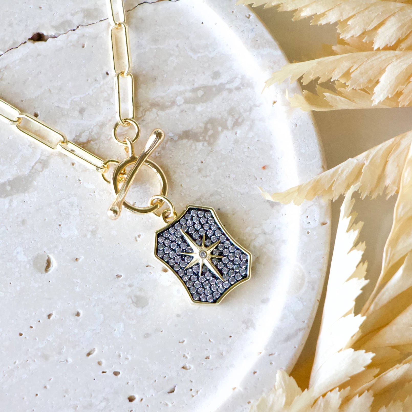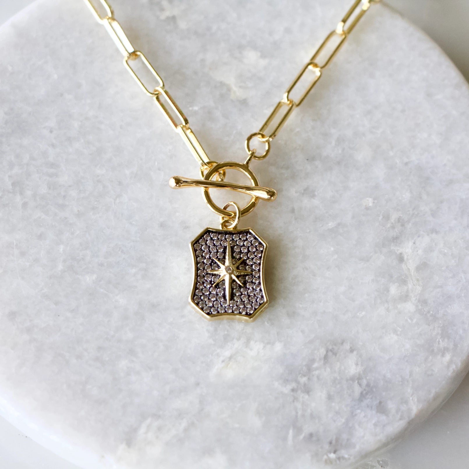 - Material: Gold-plated chain, toggle clasp- Length: 18"- Charm: 20x14mmArrives in a plastic baggie