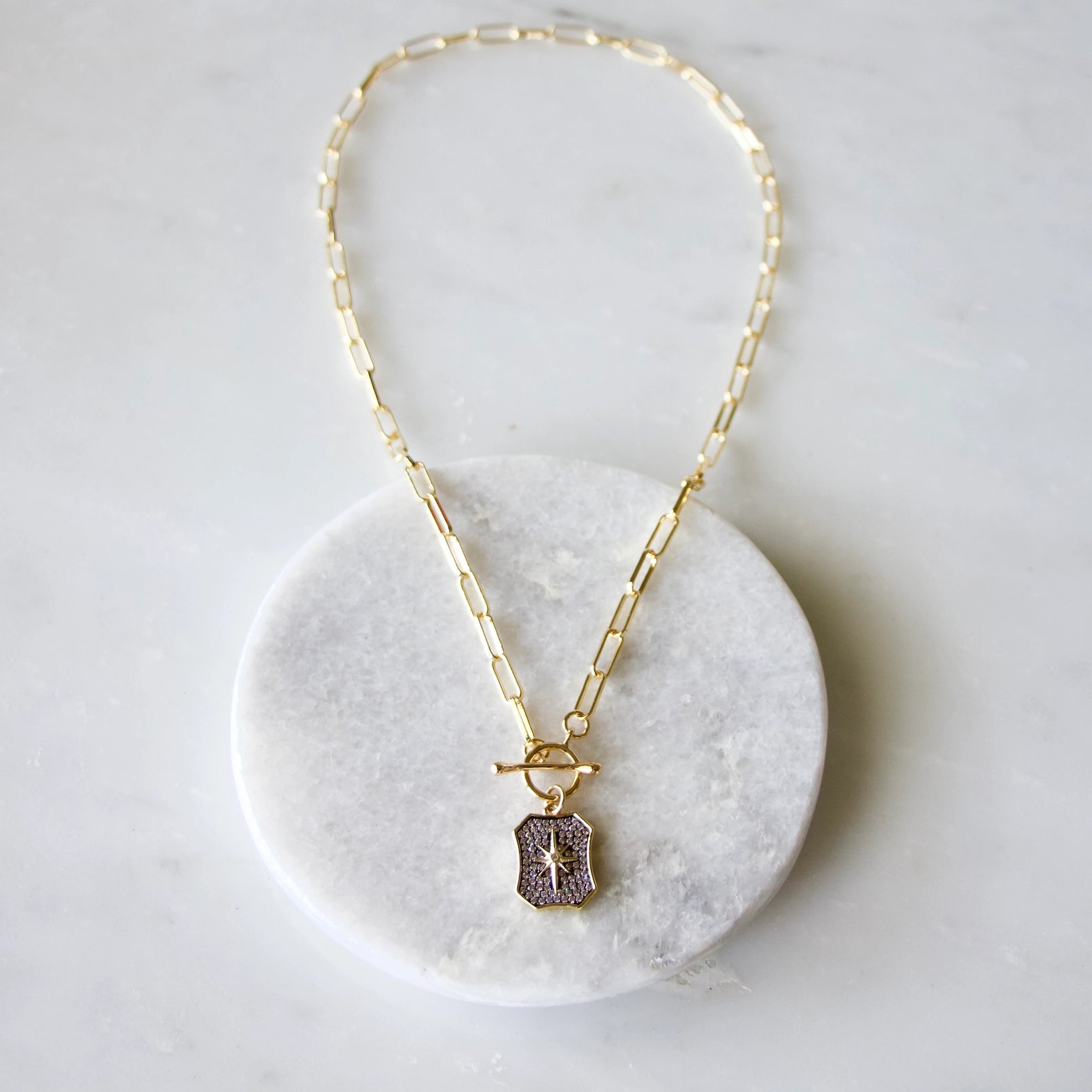 - Material: Gold-plated chain, toggle clasp - Length: 18" - Charm: 20x14mm Arrives in a plastic baggie