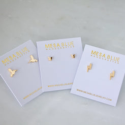Pave CZ Airplane Earrings Light weight Details: • MATERIAL: CZ, 18K gold plated over brass, lead and nickel free • SIZE: 9mm Arrives with a lipped, branded earring card