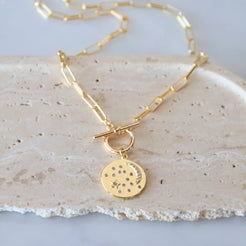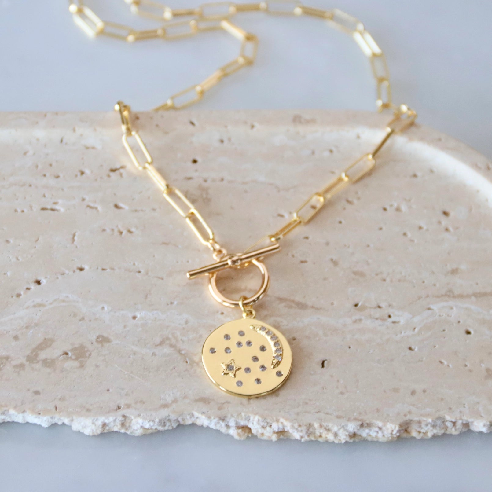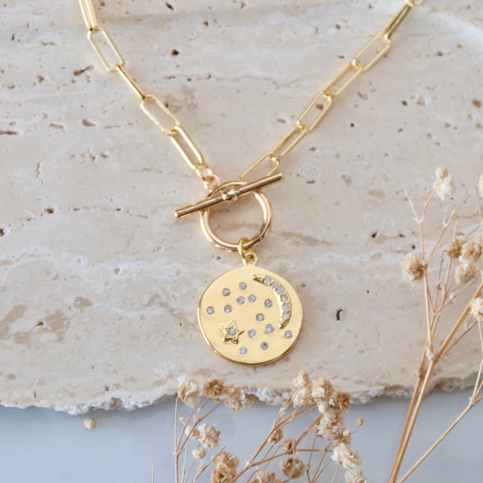 Details:• MATERIAL: 18K gold plated over brass, pave cubic zirconia• PENDANT SIZE: 21mm• CHAIN LENGTH: 17"• CLASP STY...