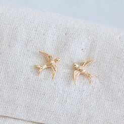 Swallow Earrings Light weight Details: • MATERIAL: 18K gold plated over brass, lead and nickel free • SIZE: 12x15mm Arrives on a lipped, branded earring card
