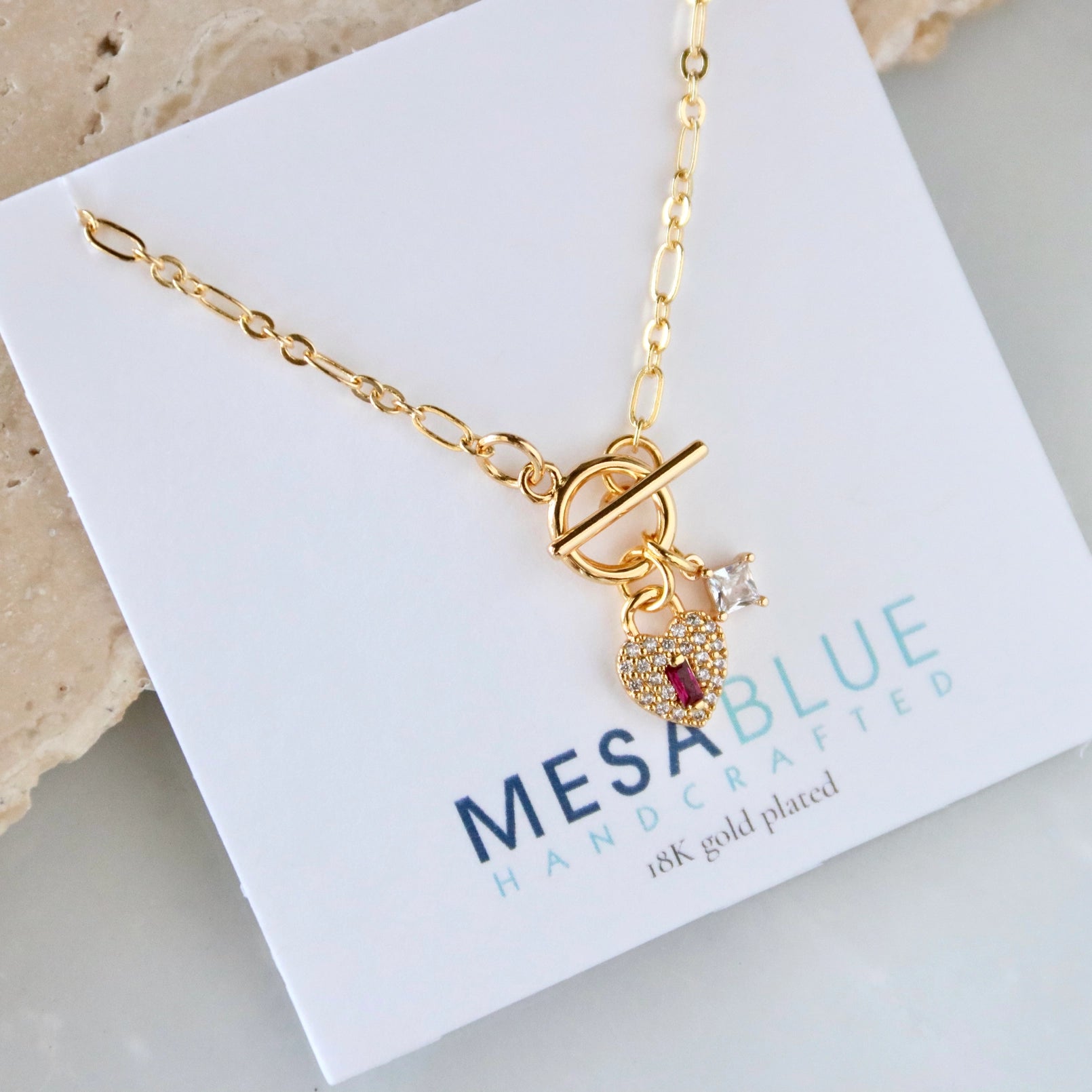 CZ Ruby Heart Lock Toggle Heart Necklace