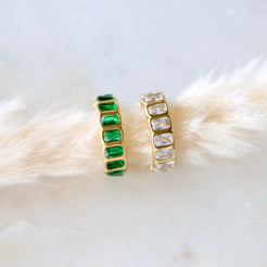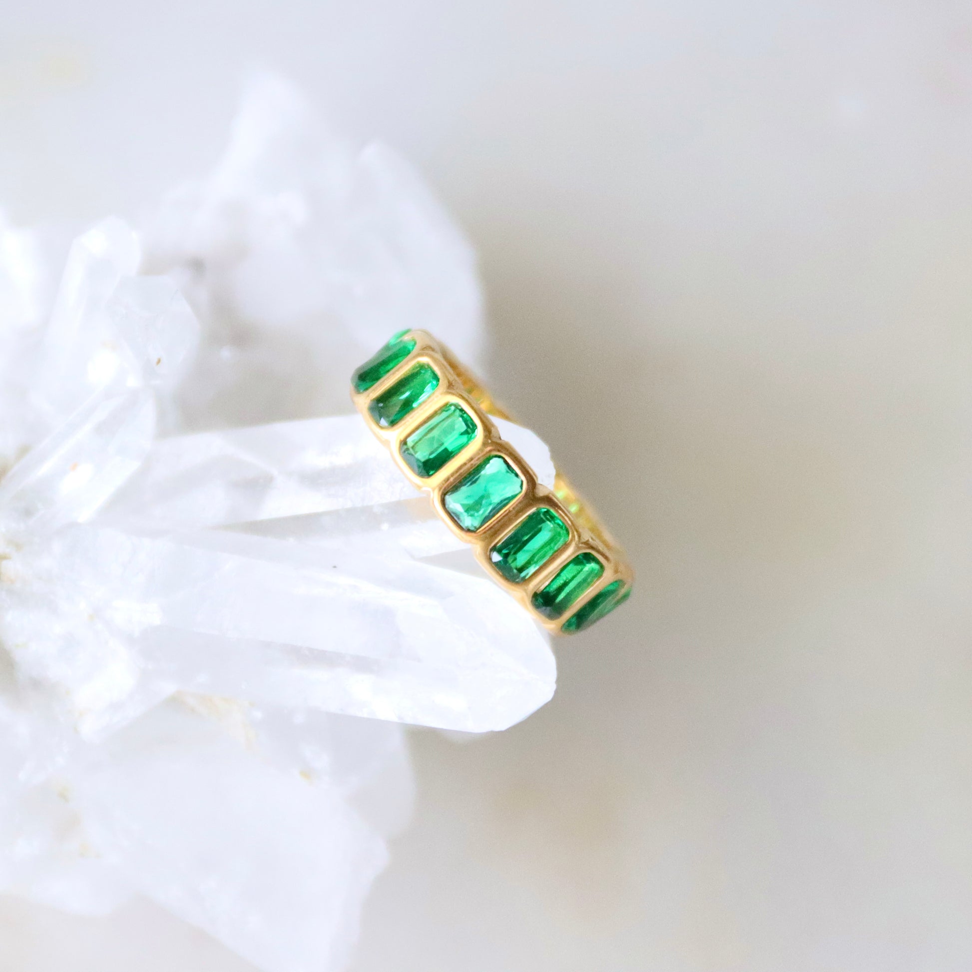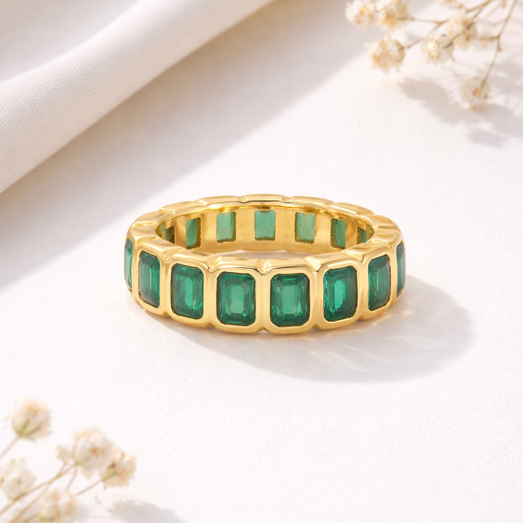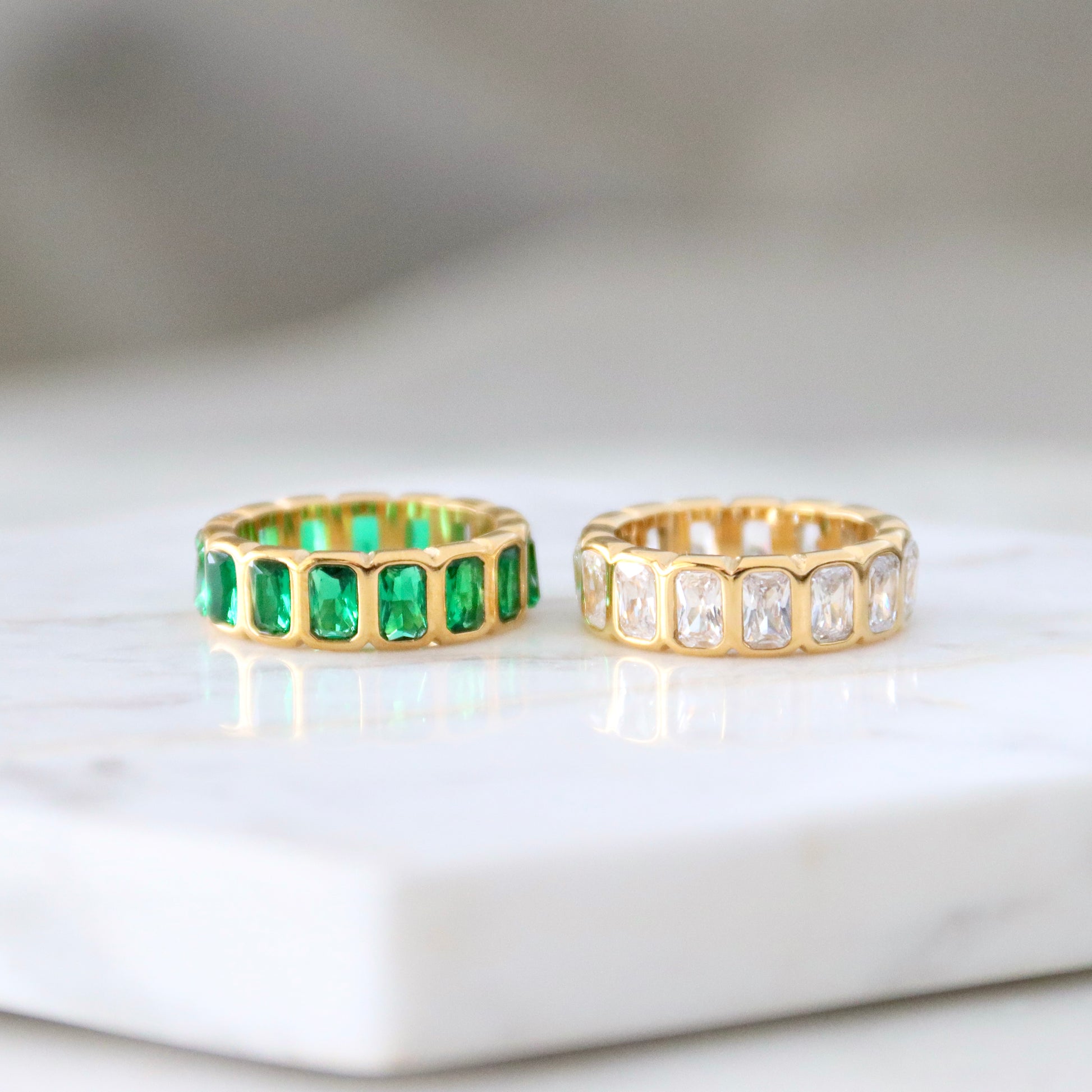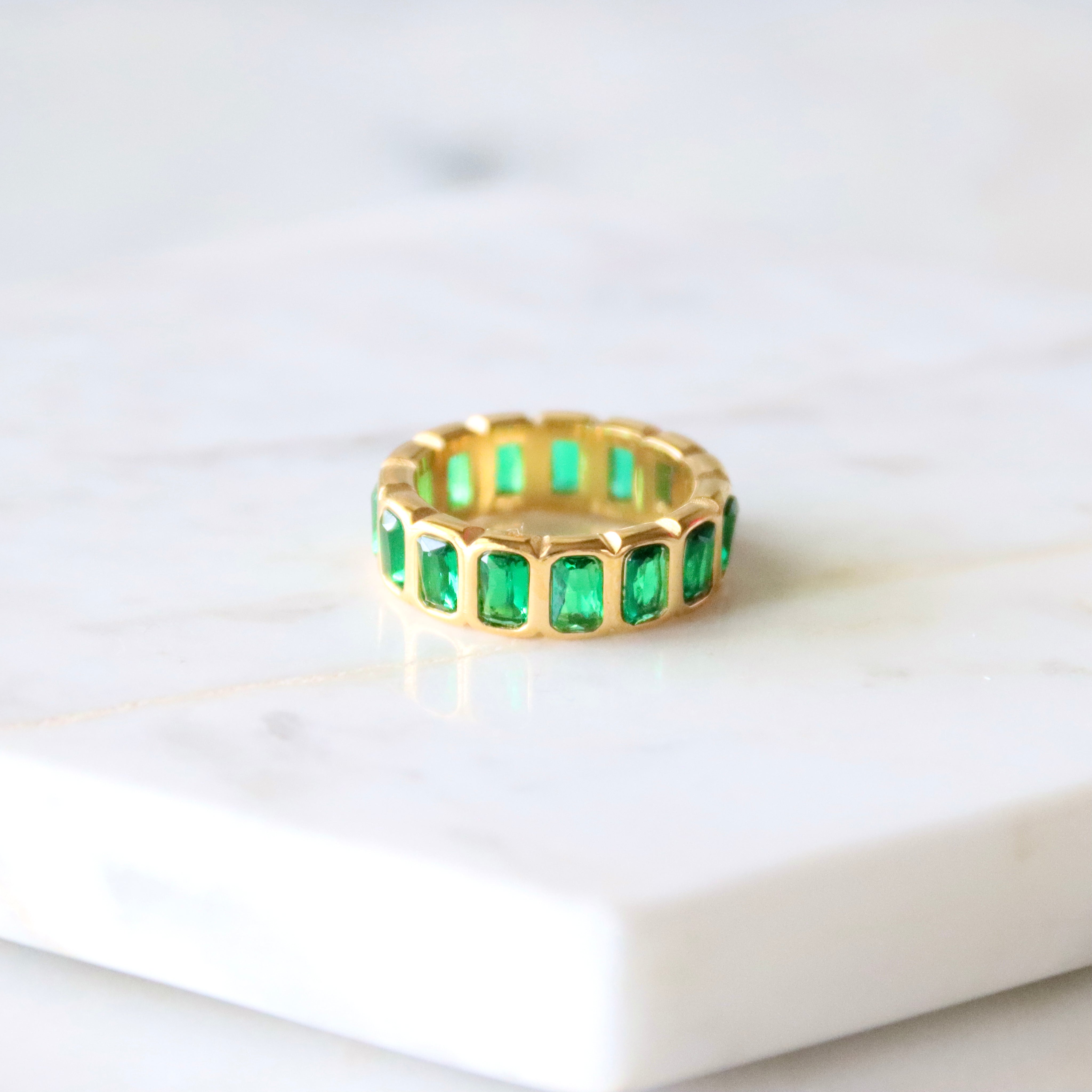 Details: • MATERIAL: PVD, 18K gold plated over stainless steel, emerald or crystal zircon • Size: US 7