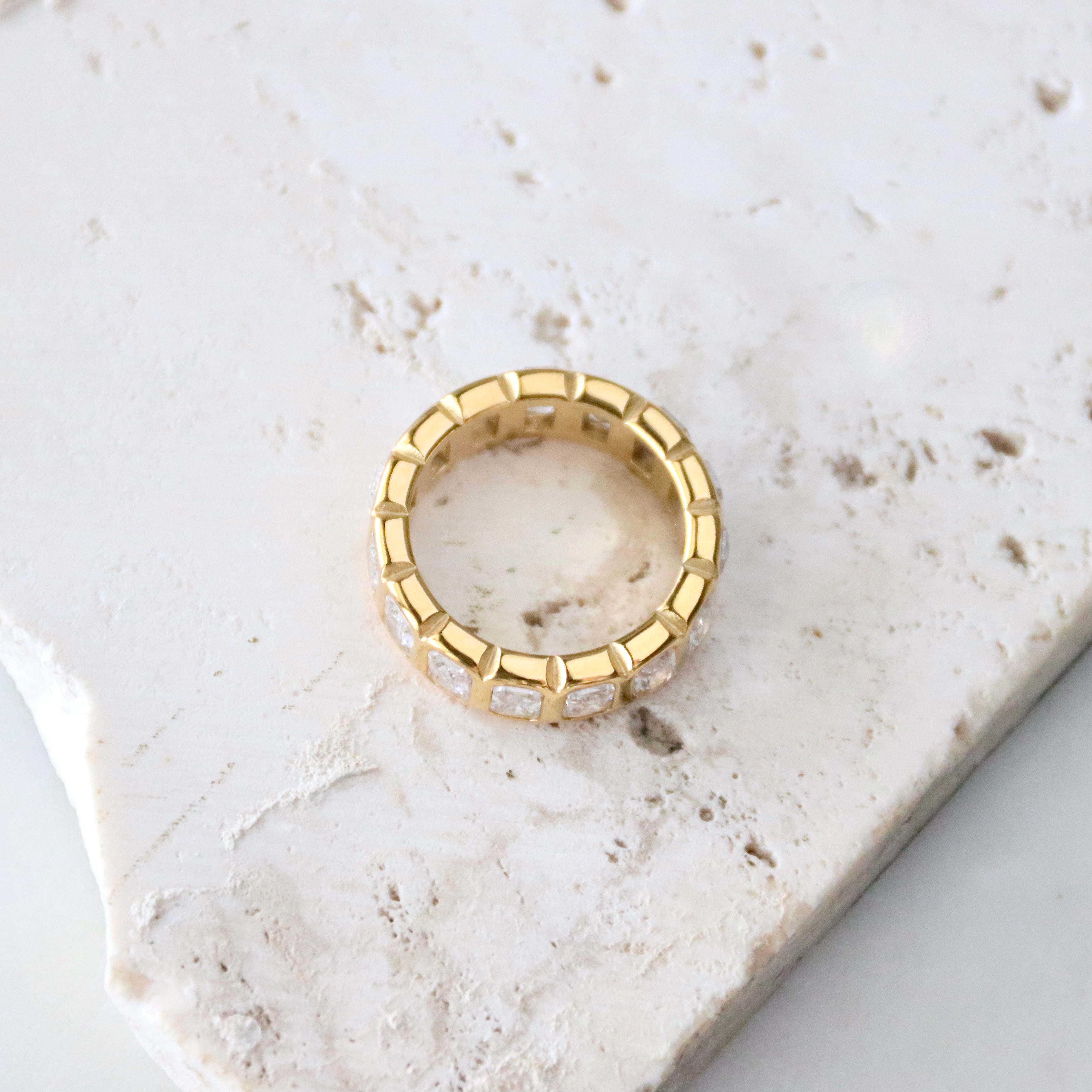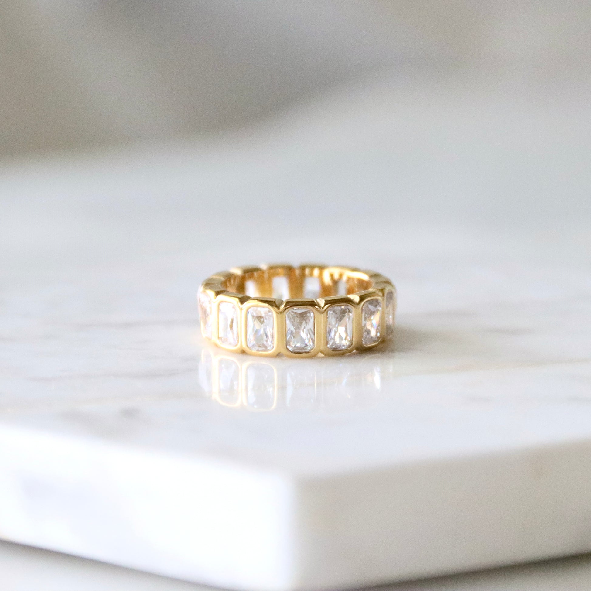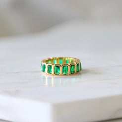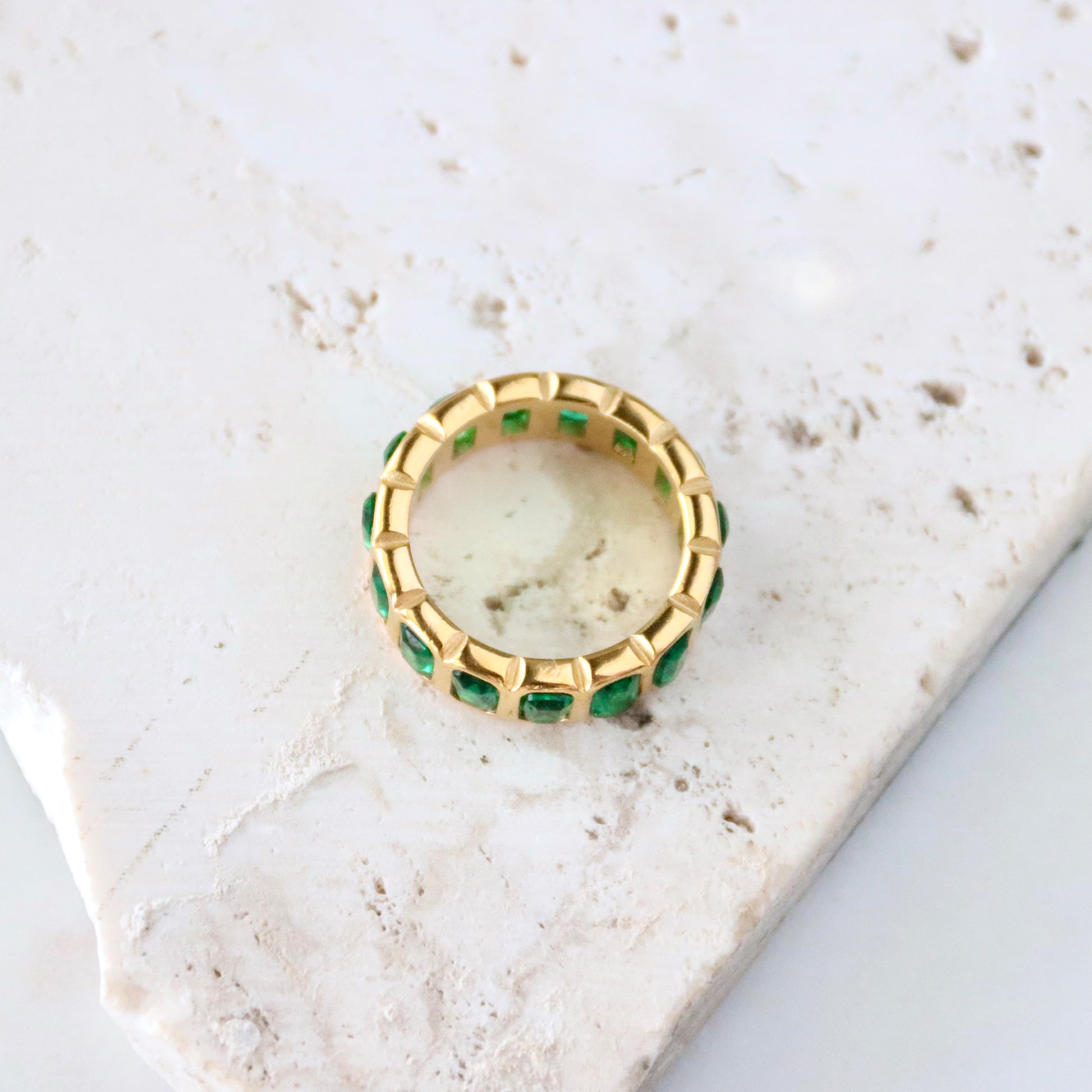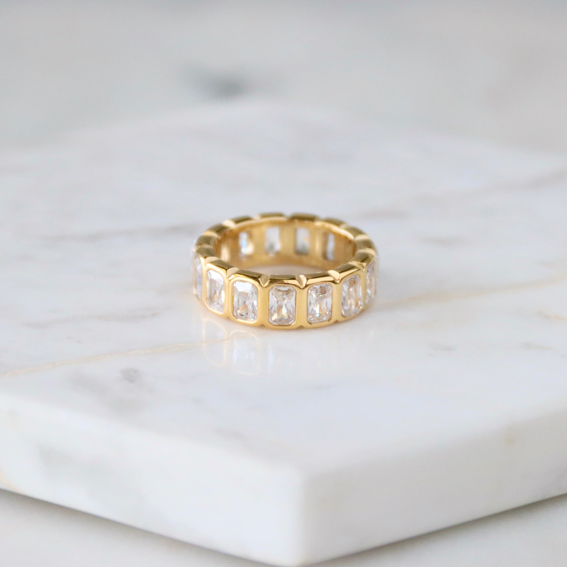 Details: • MATERIAL: PVD, 18K gold plated over stainless steel, emerald or crystal zircon • Size: US 7