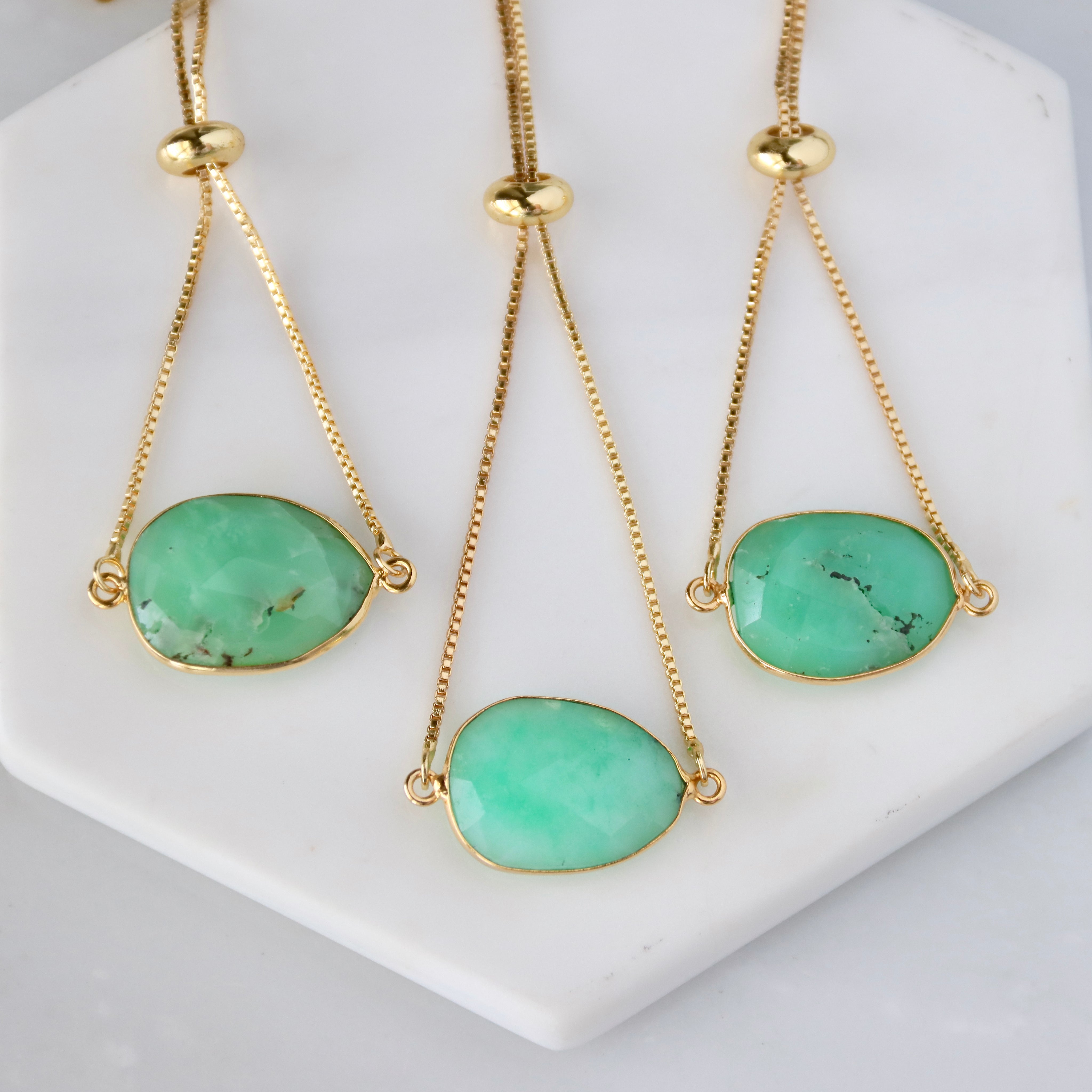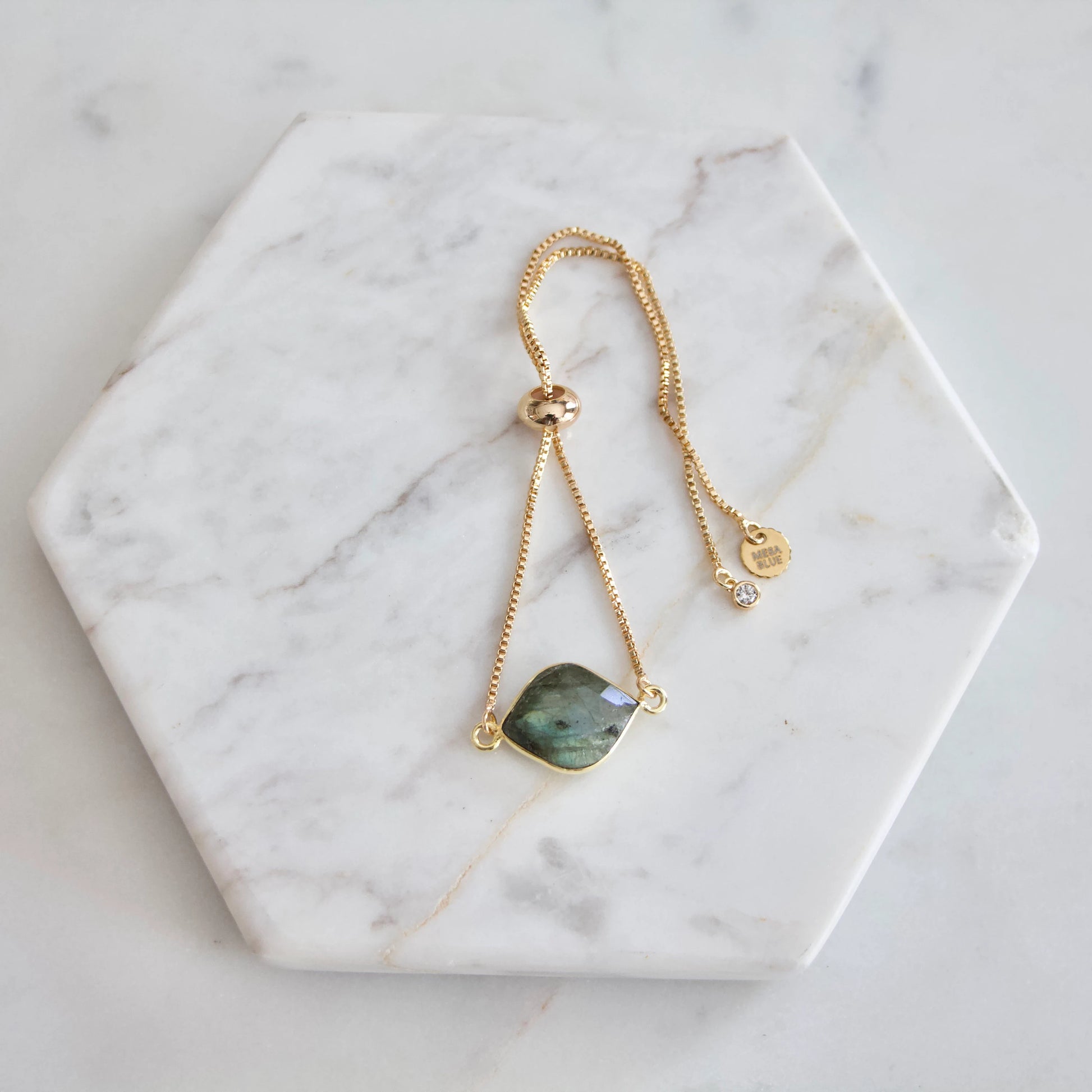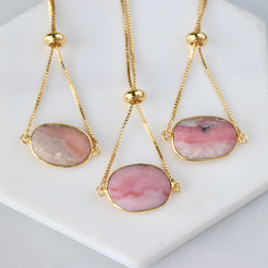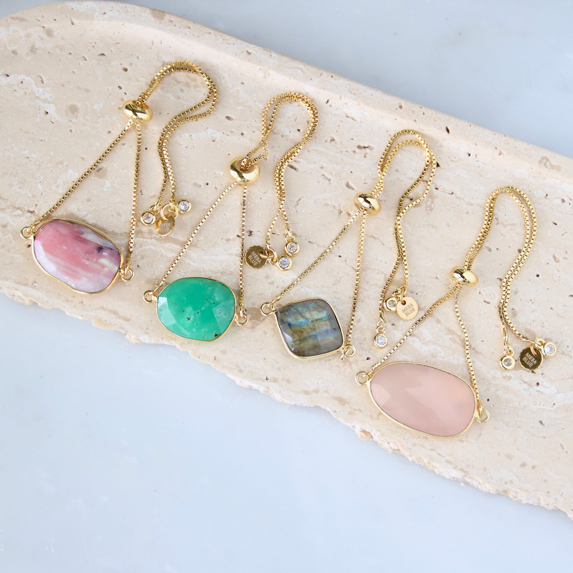 Due to the nature of the stones, they vary in size, color, and shape. Each stone is one of a kind. They are easy to put on: just pull the bead up and down the chain to adjust. Gold Plated Bracelet fits 4-9."