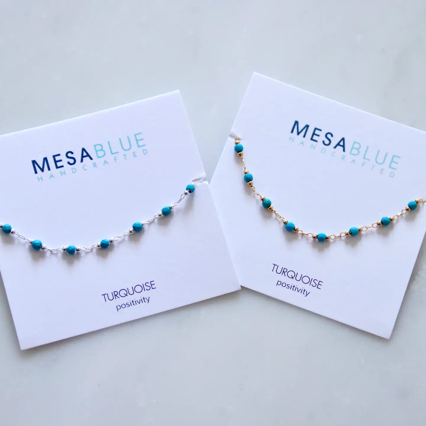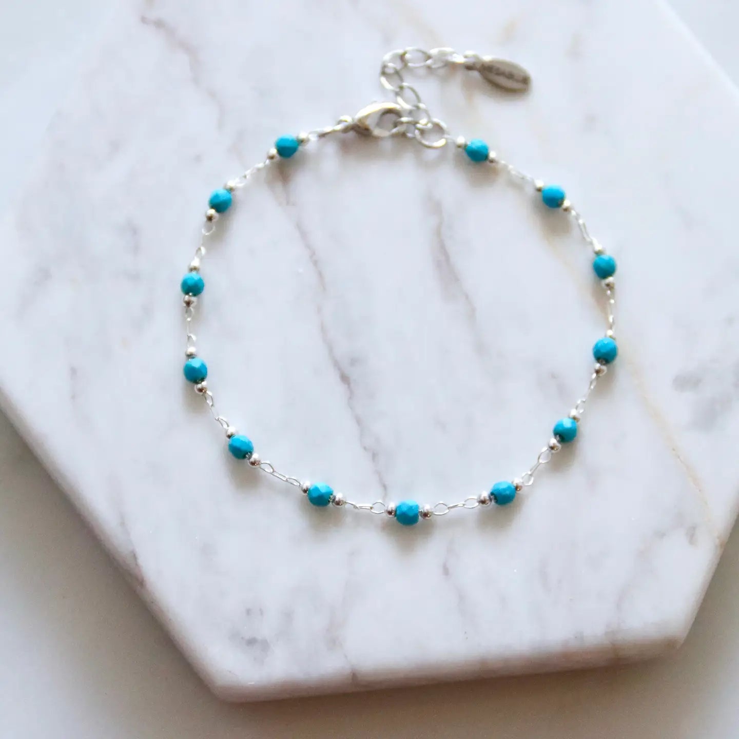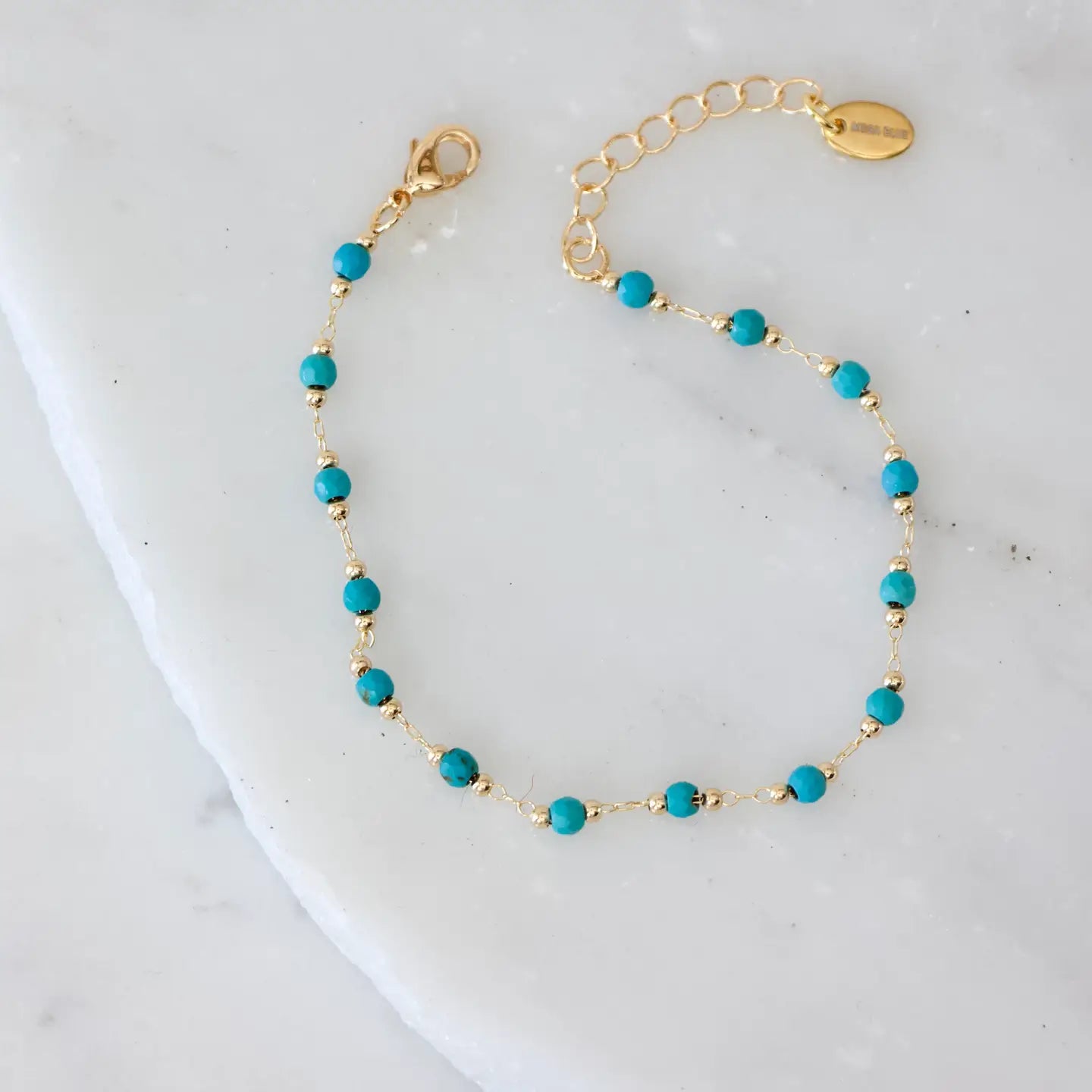 Details: • MATERIAL: Round, faceted, turquoise beads, 18K gold or silver plated over brass • CLASP: Lobster clasp • SIZE: Gold-plated over brass 6.5" + 1.5" extender