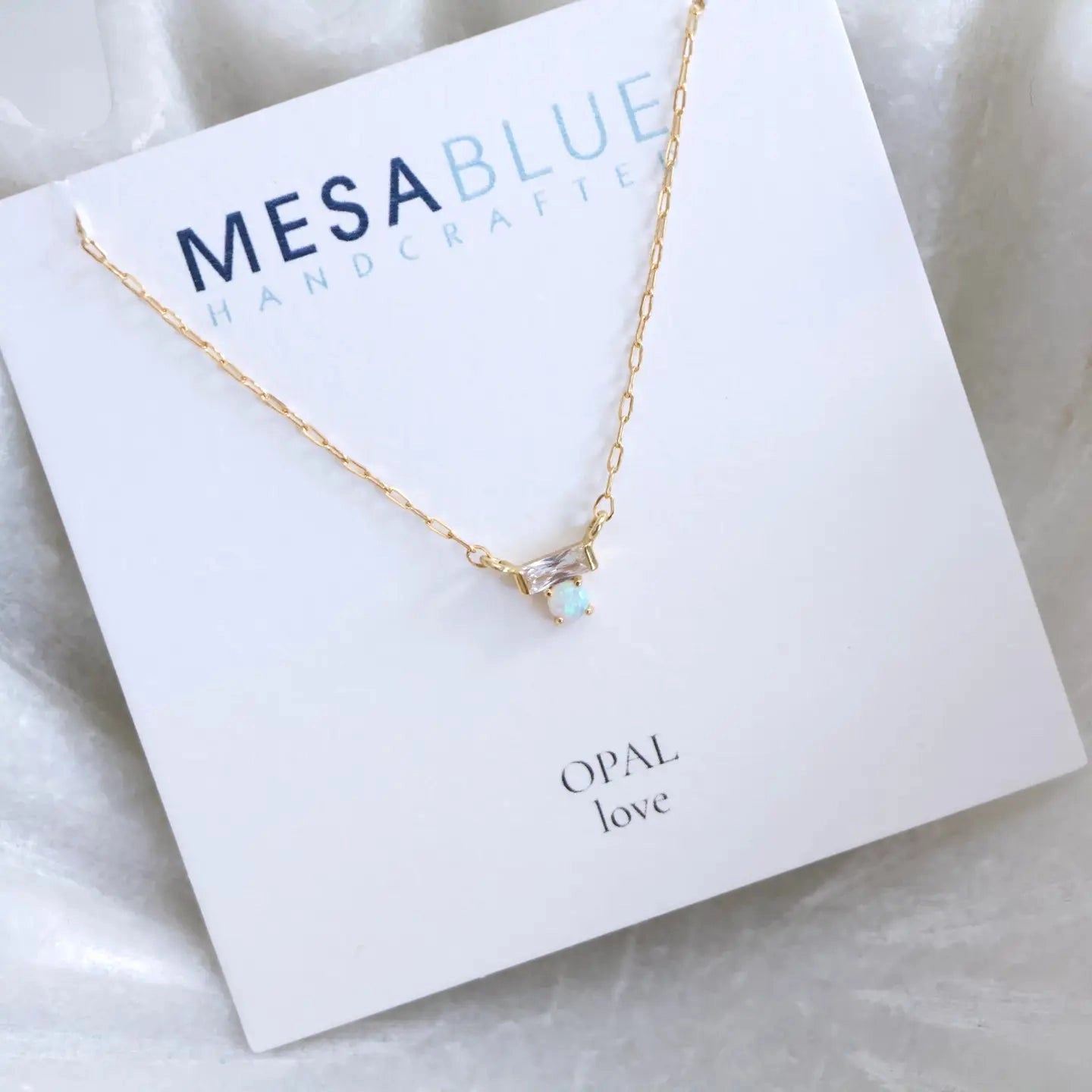Details: • MATERIAL: 18k gold plated opal and CZ charm, gold filled chain • PENDANT SIZE: 5x10mm • CHAIN LENGTH: gold filled chain • CLASP STYLE: gold filled spring ring • PACKAGING: Arrives on a branded card