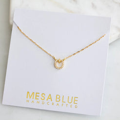 Details: • MATERIAL: 18K gold plated over brass and pave zircon charm, gold filled chain • PENDANT: 10mm, gold plated over brass • CHAIN LENGTH: Gold filled chain • CLASP STYLE: Spring ring • PACKAGING: Arrives on a branded 3x3" card