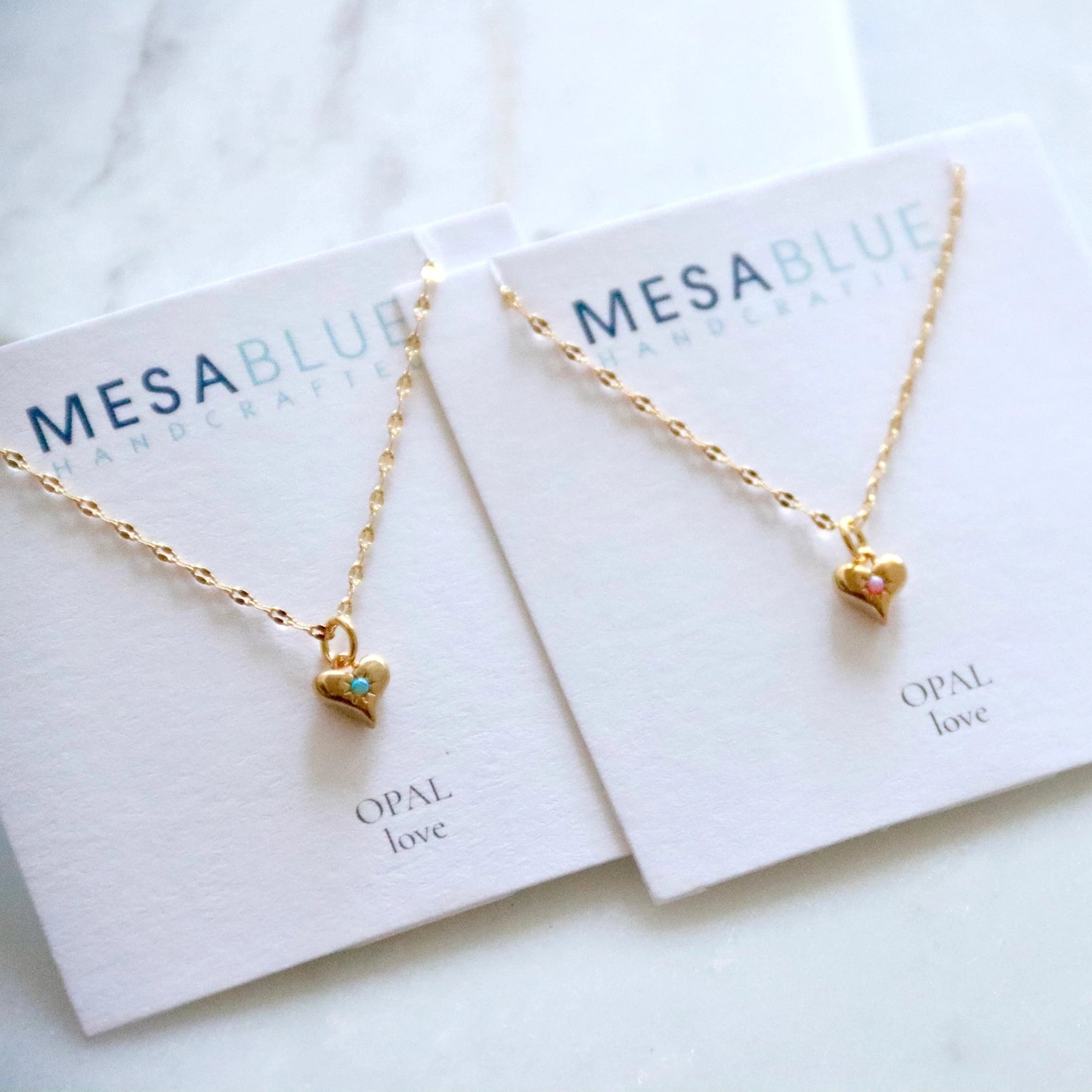 Blue or Pink Opal Necklace Details: • MATERIAL: 18K gold plated over brass, blue or pink opal • PENDANT SIZE: 6mm • CHAIN LENGTH: 15.5" + 2.25" 18K gold-plated chain • CLASP STYLE: spring Arrives on a branded card