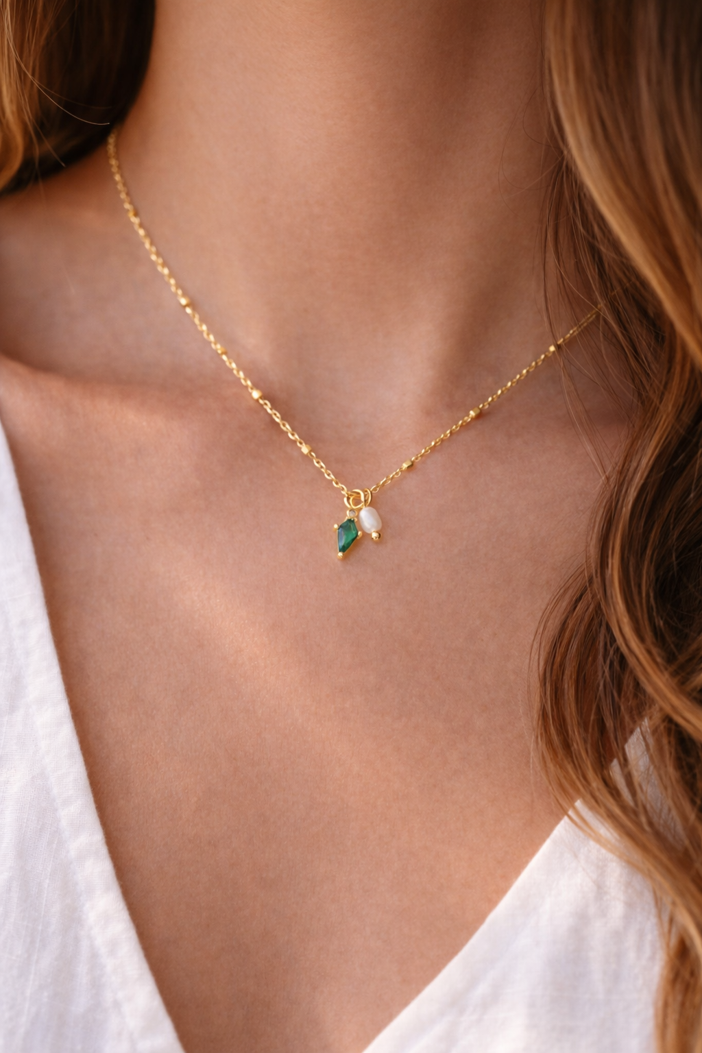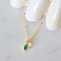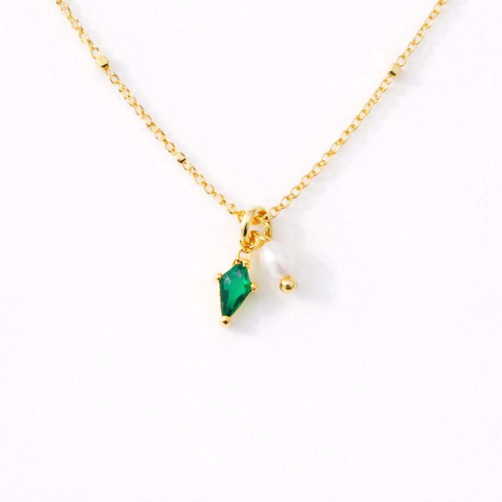 Details: • MATERIAL: 18K Gold plated over brass, emerald zircon • PENDANT SIZE: approximately 5mm mini pearl • CHAIN LENGTH: 16" + 2.75" extender chain • CLASP STYLE: Spring Arrives on a branded jewelry card