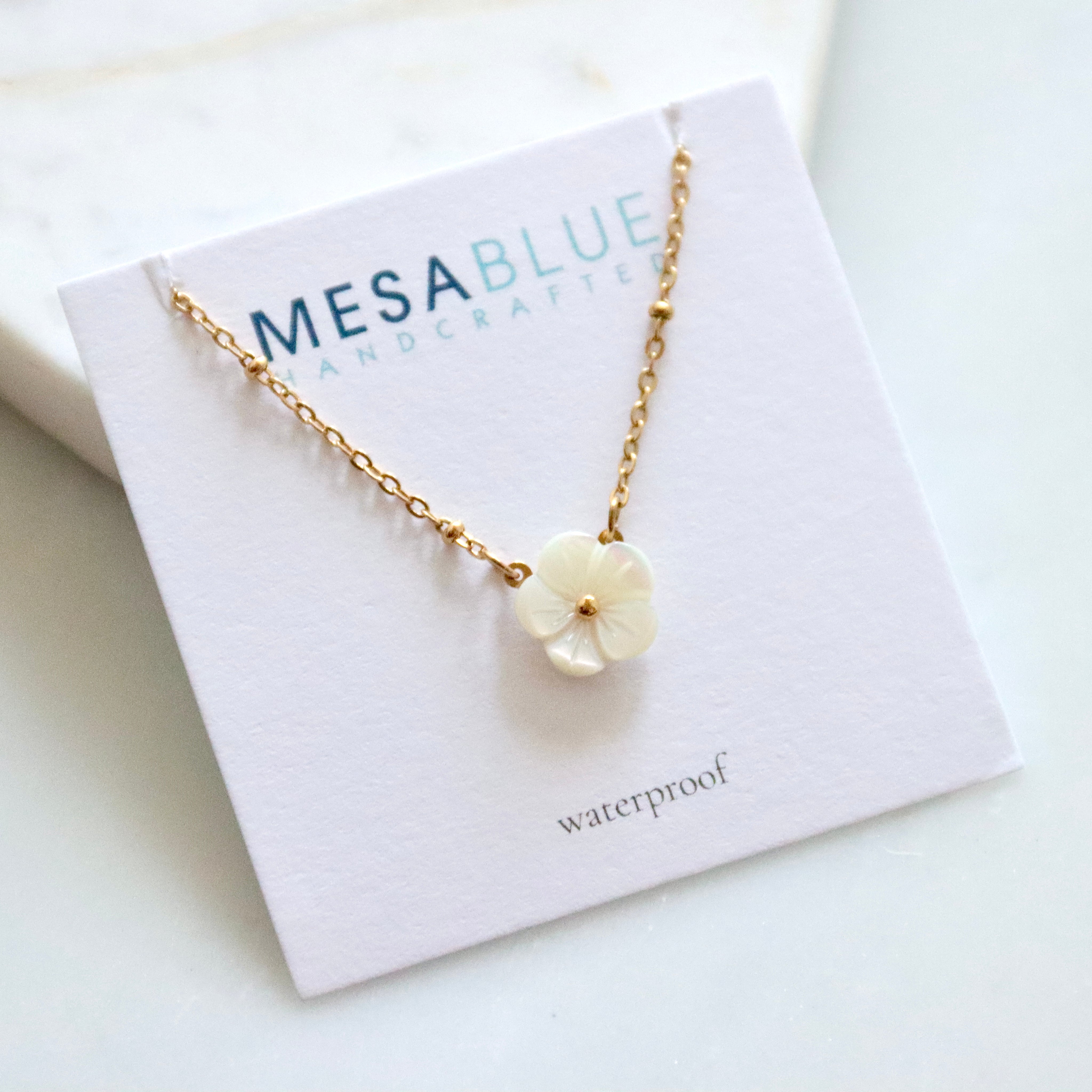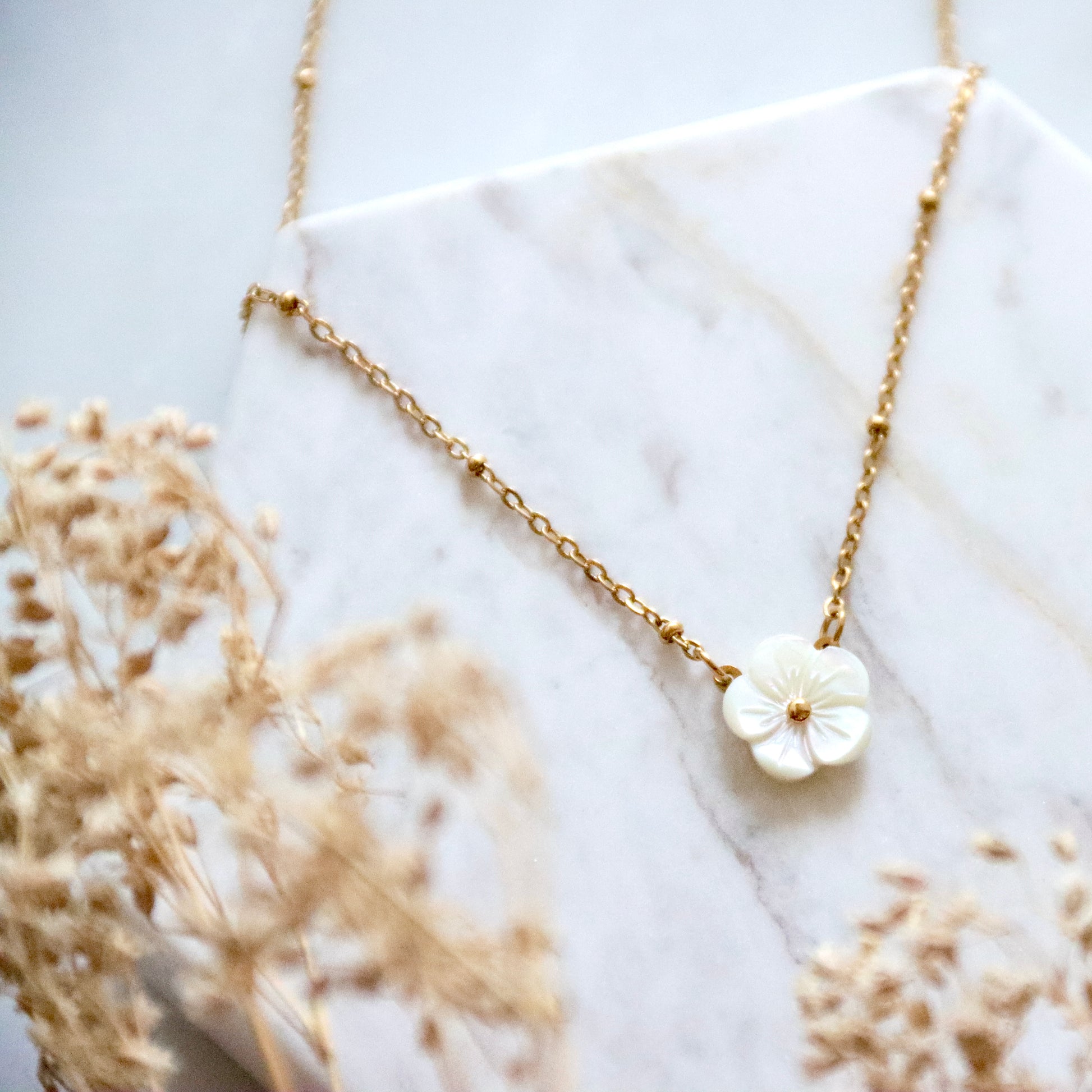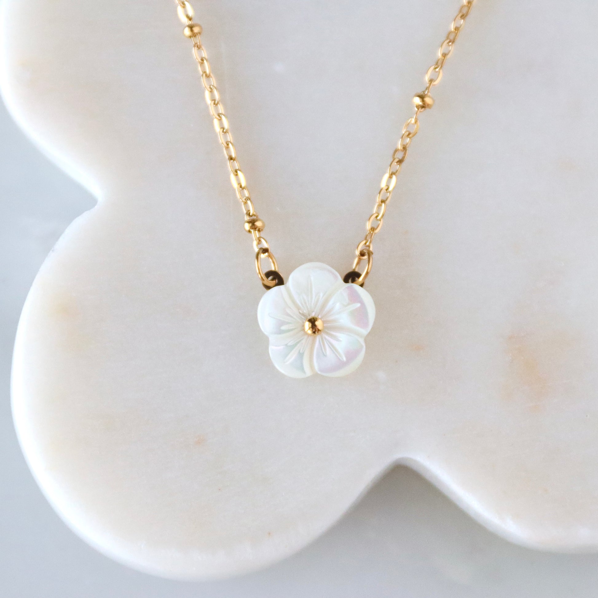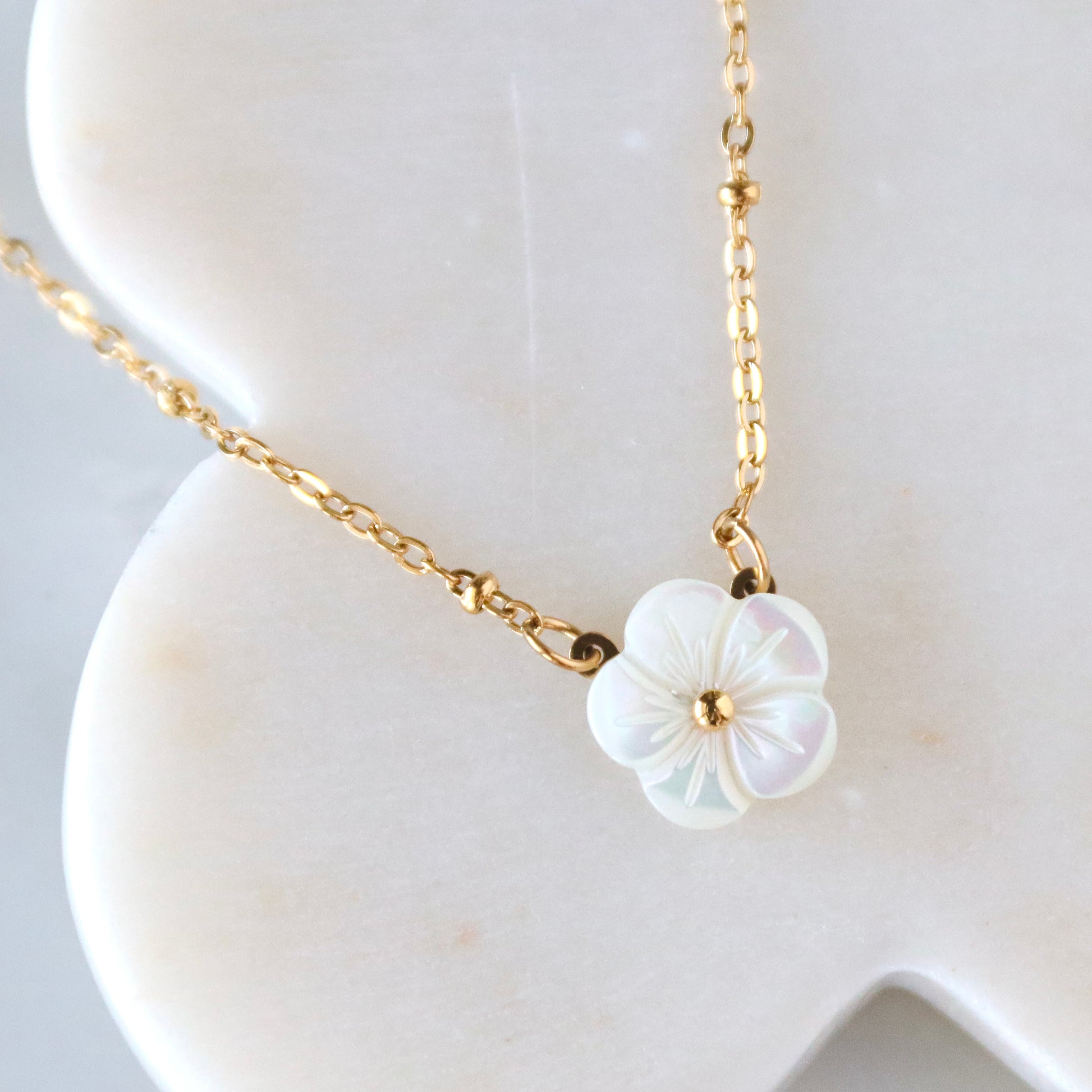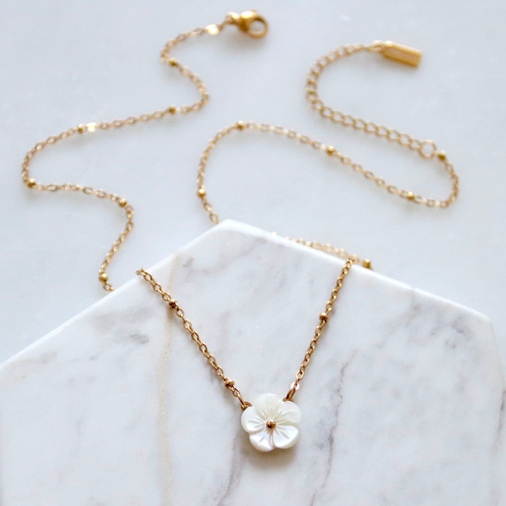 Details: • MATERIAL: Stainless steel, carved mother of pearl • CHAIN LENGTH: 16" + 2" extender chain • CLASP STYLE: Lobster • PACKAGING: Arrives on a branded card