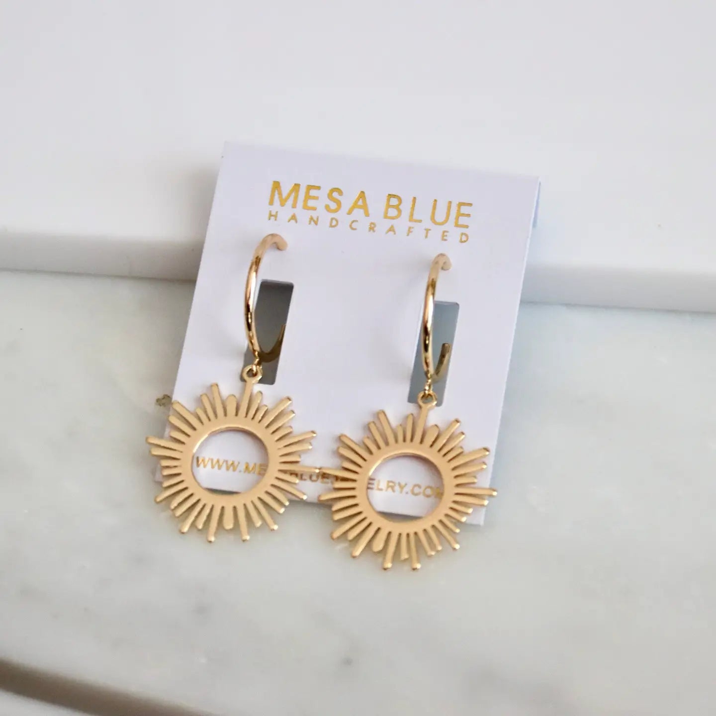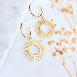 Details: • MATERIAL: 18k Gold plating over brass • EARRING SIZE: 30x27mm sun disc, 20x23mm hoop arrives with a branded jewelry card
