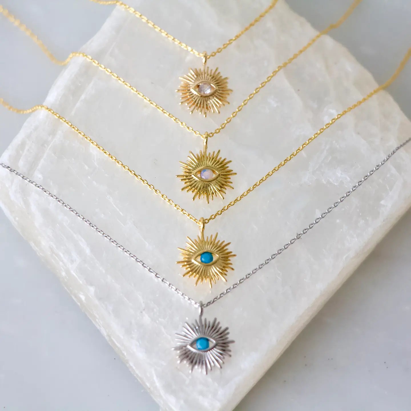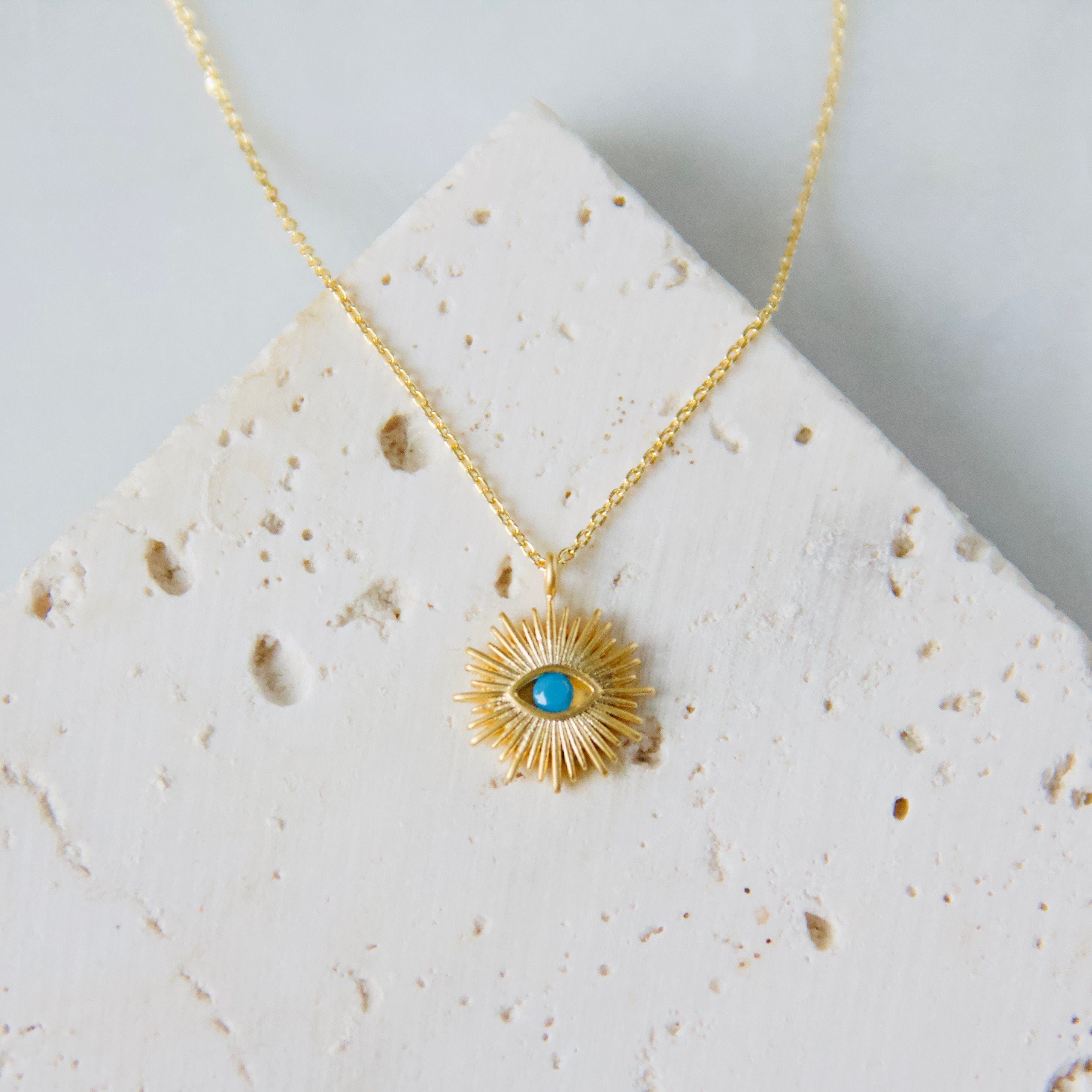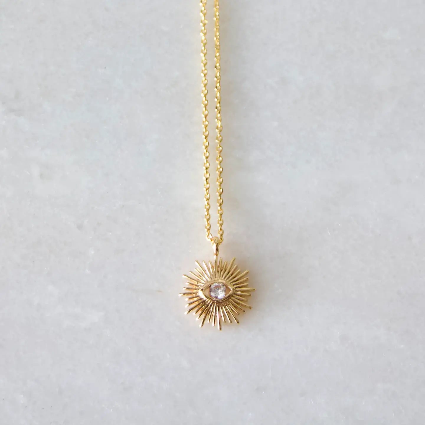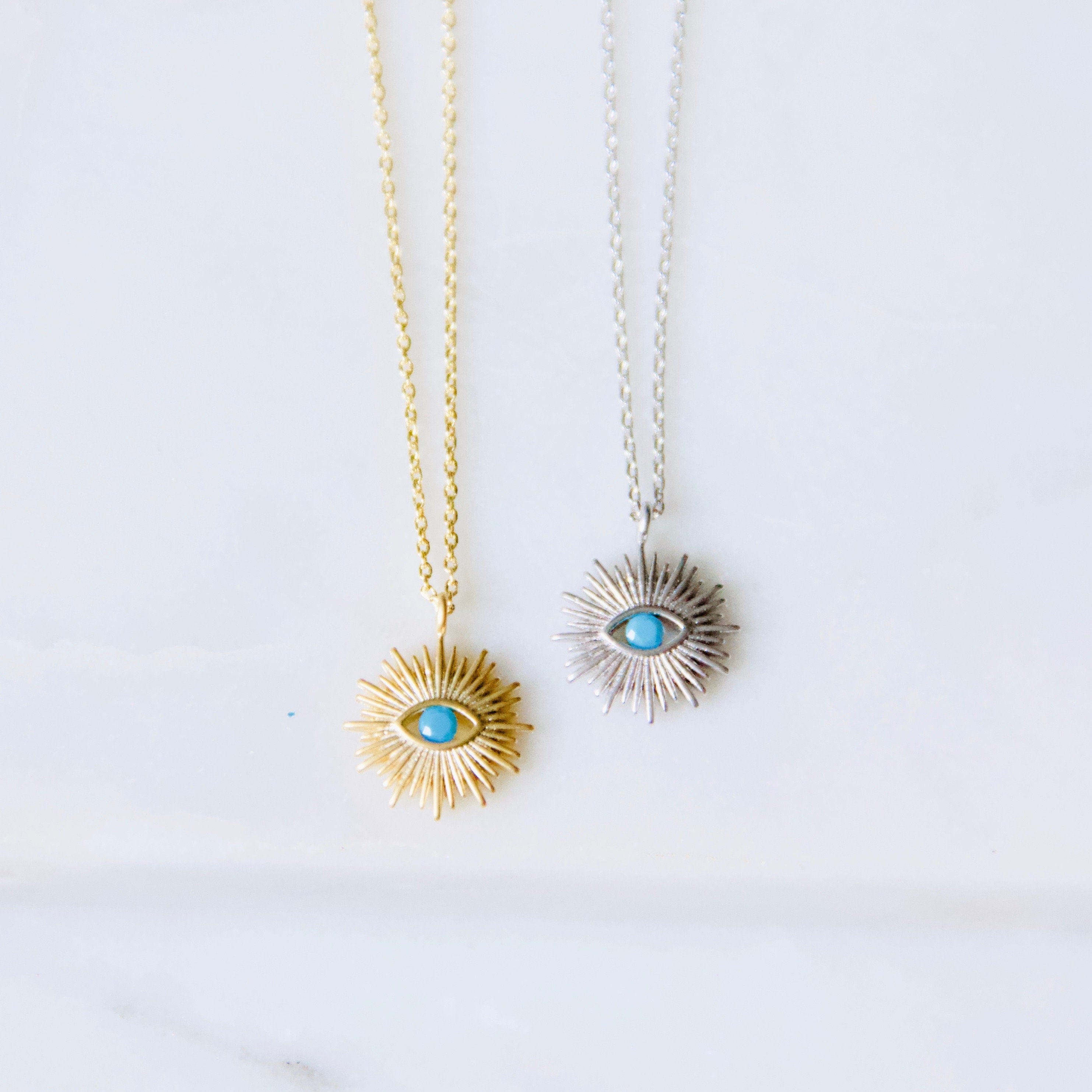 Dainty gold-plated or silver-plated evil eye sun with a faceted stone in the center, hung on a thin cable chainPerfec...