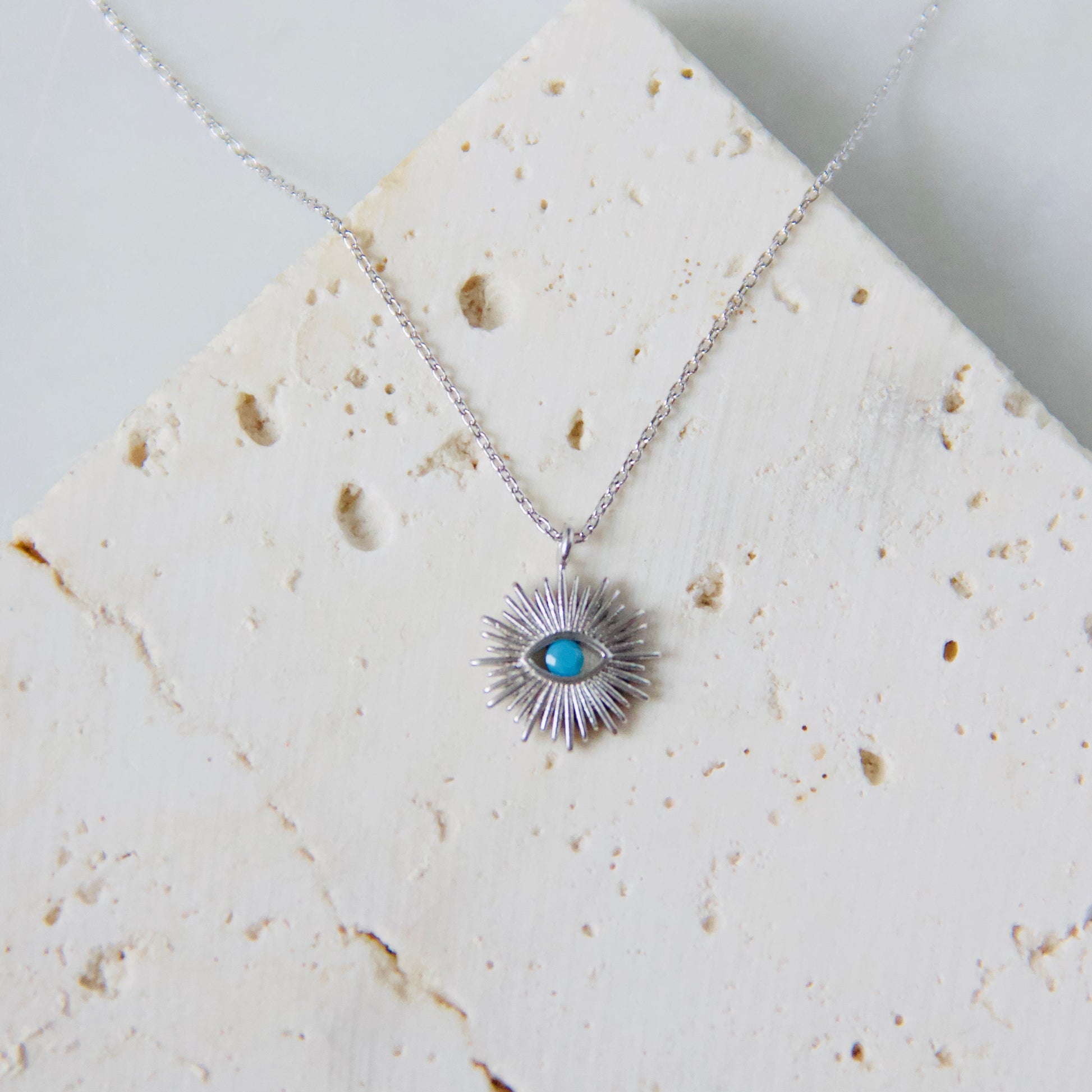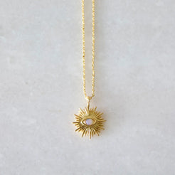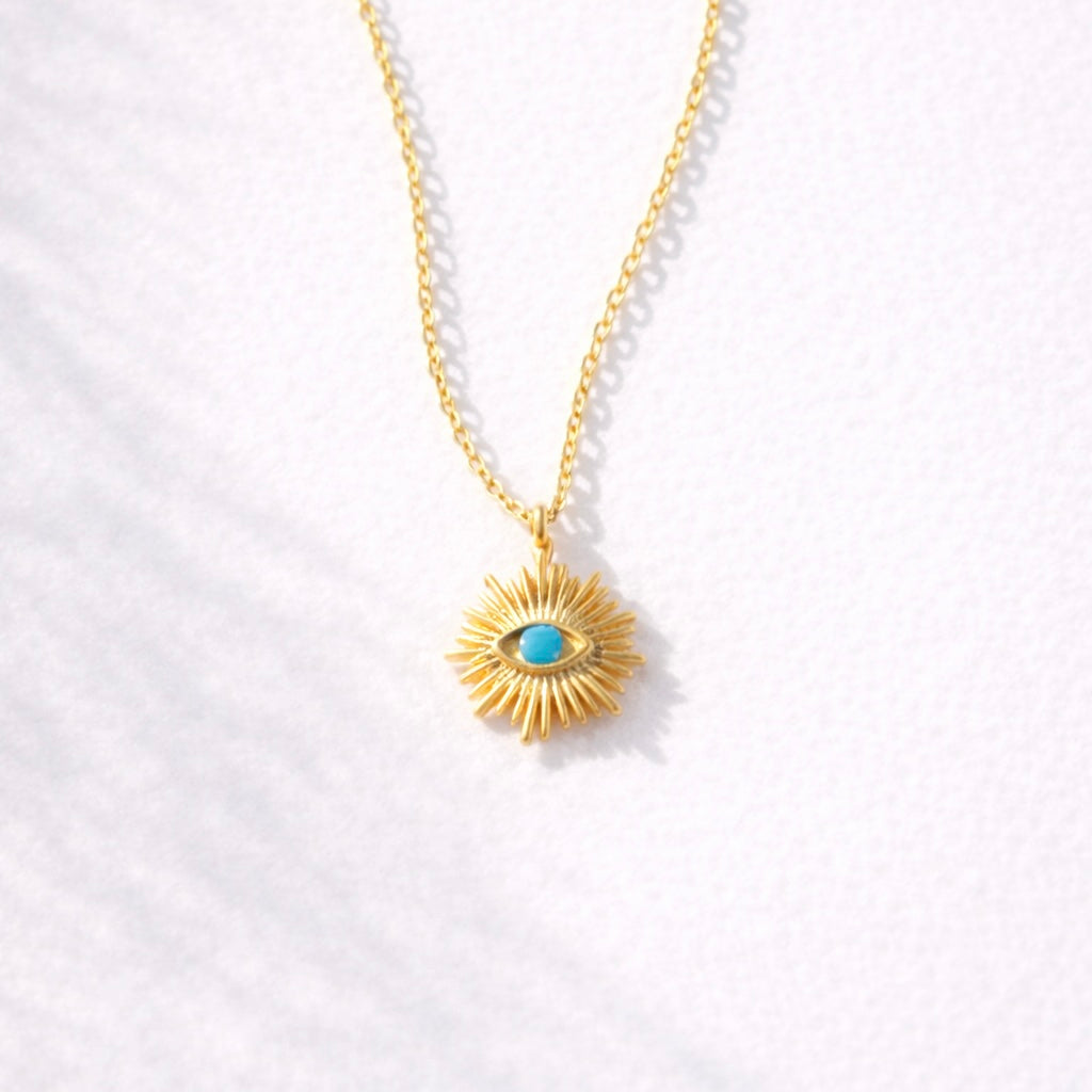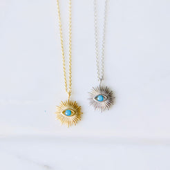 Dainty gold-plated or silver-plated evil eye sun with a faceted stone in the center, hung on a thin cable chain Perfect for everyday wear.