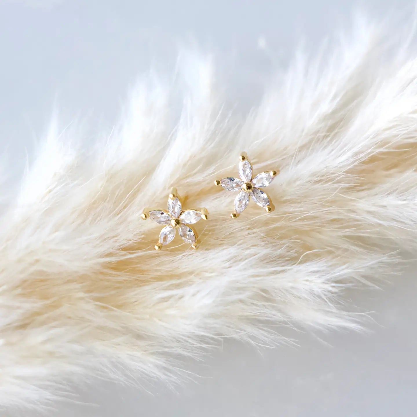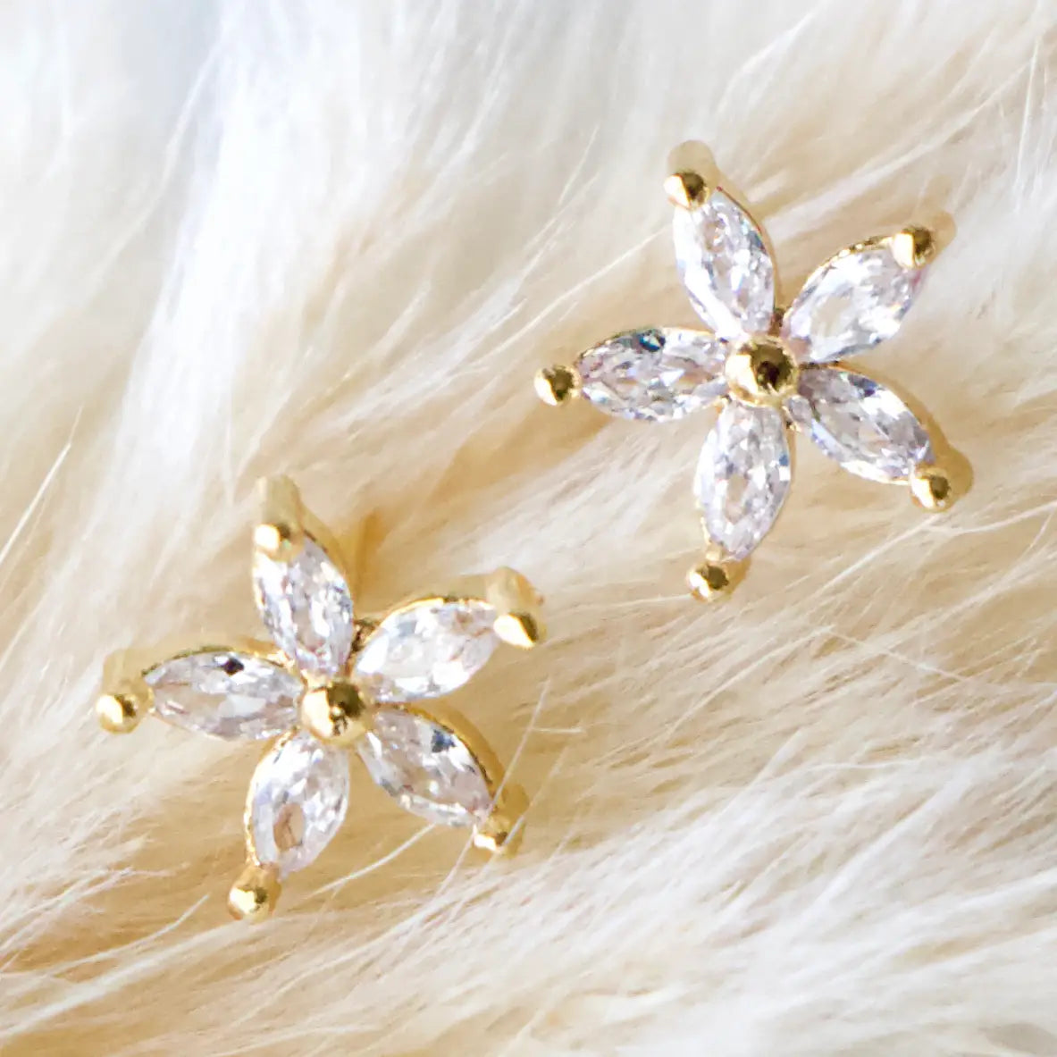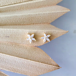 Pave CZ Flower Earrings Light weight Details: • MATERIAL: CZ, 18K gold plated over brass, lead and nickel free • SIZE: 6mm Arrives on a branded, lipped earring card
