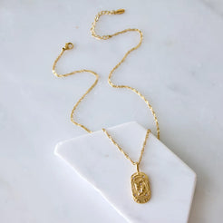 Details: • MATERIAL: PVD 18K gold over stainless steel • PENDANT SIZE: 20x11mm • CHAIN LENGTH: 16" + 2" extender chain • CLASP STYLE: Lobster Arrives on branded jewelry card